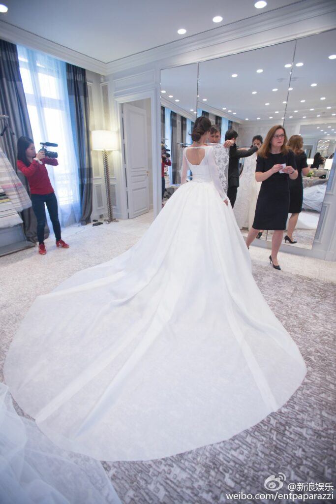 Her gown was a couture Dior design that took over five months to make. The elaborate design, which is composed of 165 feet of tulle and 115 feet of ivory satin organza, has nearly a hundred hand-cut Chantilly lace rose bouquets and a 10-foot train.
