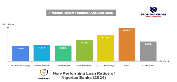 In 2024, Nigeria’s banking sector kept its non-performing loan (NPL) ratio at a moderate level, ranging between 3.8 percent and 4.5 percent, which was within regulatory limits, though slightly higher by year-end. Most major banks, such as Access, Fidelity, Zenith, and Stanbic IBTC, performed well, keeping their NPLs between 3 percent and 4 percent. However, GTCO crossed the regulatory limit with an NPL above 5 percent, while UBA recorded a worrying 6.64 percent in stage-3 (credit-impaired) loans, showing clear signs of weakening credit quality. Taken together, this means that while the sector appears stable overall, stress in a few large banks could spill over and affect the wider financial system if not carefully managed.