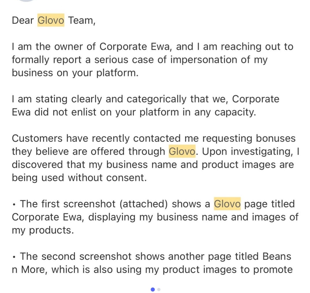 While Glovo later indicated it had reviewed the complaint and taken down the listing, the owner said subsequent checks showed the listing remained active, with unchanged branding and images. She added that the listing had amassed over 1,000 reviews, with some customers reporting illness, resulting in reputational damage and declining sales.