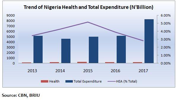 The Nigeria health sector unlike the education experienced steady growth in sectoral expenditure to its total government’s expenditure in 3 years from 3.47 percent, 4.27 percent to 5.17 percent in 2013, 2014 and 2015 respectively. There was a significant increase of 31.5 percent which amounted to N61.74 billion in expenditure in 2015 from N195.98 billion in 2014. This is the highest increase in expenditure within those consecutive years from 1999 to 2017. Although there was 21.5 percent decrease in health expenditure in 2016, because in that year, health expenditure as a percentage of total expenditure amounted to 3.92 percent, the expenditure increased to N236.1 billion in 2017 from N202.36billion in 2016. This increase was not commensurate to health expenditure as a percentage of total expenditure which further dropped to 2.48 percent.