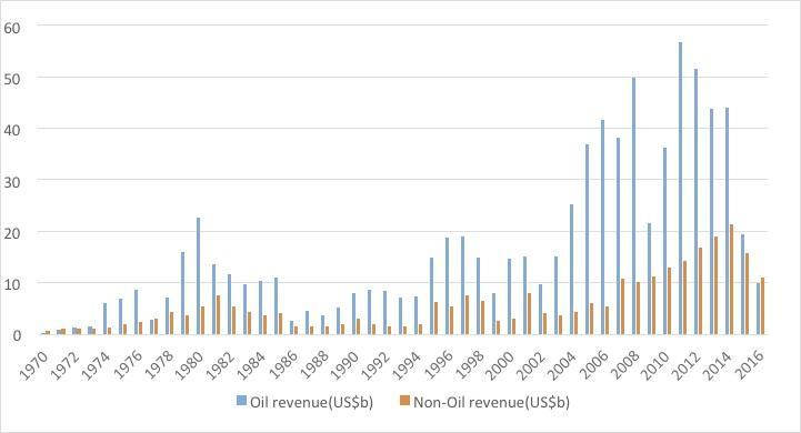 In new findings from the Oxford Martin School’s African Transitions research programme, we determined that in 2015, for the first time since 1971, Nigeria already earned more from non-oil sources than from oil revenues. The transformation to a post-oil future is already in the past.The change has come from both a rise in non-oil tax collection, and a decline in oil prices and thus revenues. In the latest year for which figures are available, Nigeria’s total oil and non-oil revenues were equal to 6.27% of GDP. Of that, Federal Government relied on oil income for only N433 billion or 47% of its revenues, far from the higher figures often quoted in popular and academic sources. This is equal to 2.63% of GDP while non-oil revenues from Federal and State Governments combined amounted to N602.19 billion or 3.64% of GDP.