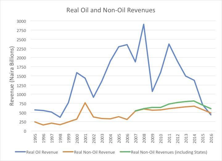 This way of laying out the figures shows us that the real values have a much smaller upward trend between 1995 and 2016. In other words, the gains of increased tax effort by the Federal Inland Revenue Service (FIRS) and other agencies in collecting more revenue and enlarging the tax base, were undermined by negative factors including inflation, and possibly also currency movements and recession. Not only did oil revenues earned in dollars fall, but the dollars converted to ever-more Naira. Further, non-oil tax revenue moved similarly with the commodity price booms. So as oil revenues dropped, non-oil revenue increases just about held the line, but weren’t able to turn public finances around on their own.