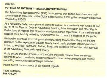 In a 3 September letter addressed to an online fashion firm, and signed by the Acting Registrar, Ijedi Iyoha, APCON said: “all communication materials regardless of the medium” needed to go through it before it is released to the public. Its guideline also requires the owners of the advert materials to pay a minimum vetting fee of N25,000 per material.