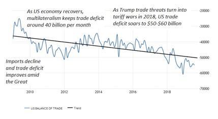 Unfortunately, monthly data does not reflect secular trends and overall deficit trend matters. In longer view, US trade deficit improved during the Great Recession, when imports declined. As the economy recovered in the early 2010s, multilateralism still kept trade deficit around $40 billion per month.