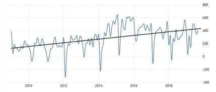 The change came when President Trump’s trade threats turned into tariff wars in 2018. Since then, the trade deficit has been around $50 to $60 billion per month, while the trend line (in black) suggests progressive deterioration