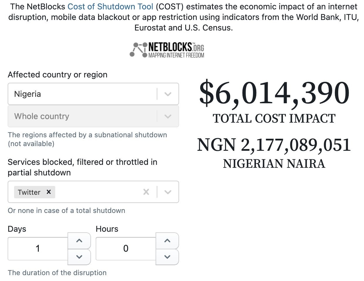This is according to estimates from the Netblocks’ Cost of Shutdown Tool (COST). A total shutdown would cost the country N2.3 billion ($5,593,819).
