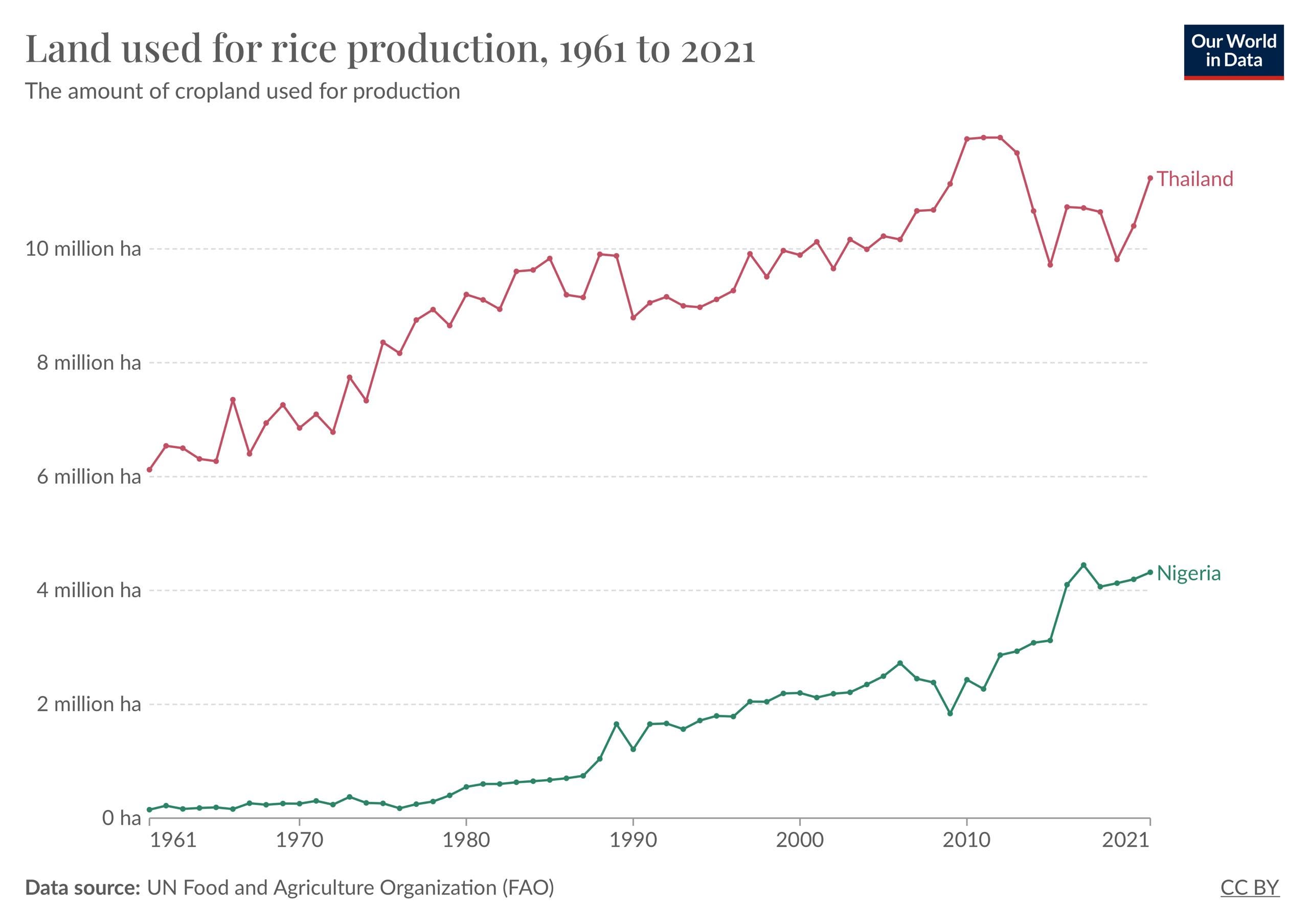 In summary, Thailand’s much larger production of rice, compared to Nigeria, is explained almost entirely by using far more land for rice farming. This makes sense given that yields are not too far off from Nigeria. So the solution for Nigeria to produce that extra 25% of consumption it needs locally is fairly straightforward – dedicate more land to farming rice. For sure, Nigeria is a much larger country than Thailand, in terms of land area so if Thailand can find 10 million hectares to plant rice, Nigeria can find a few more million hectares to boost rice production.