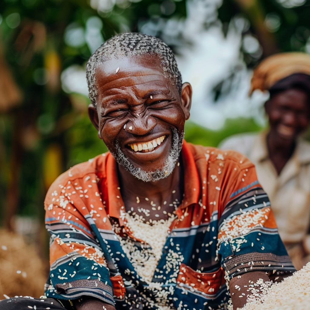 MidJourney Prompt: Nigerian farmer discarding cassava in favour of rice with a very happy smile on his face