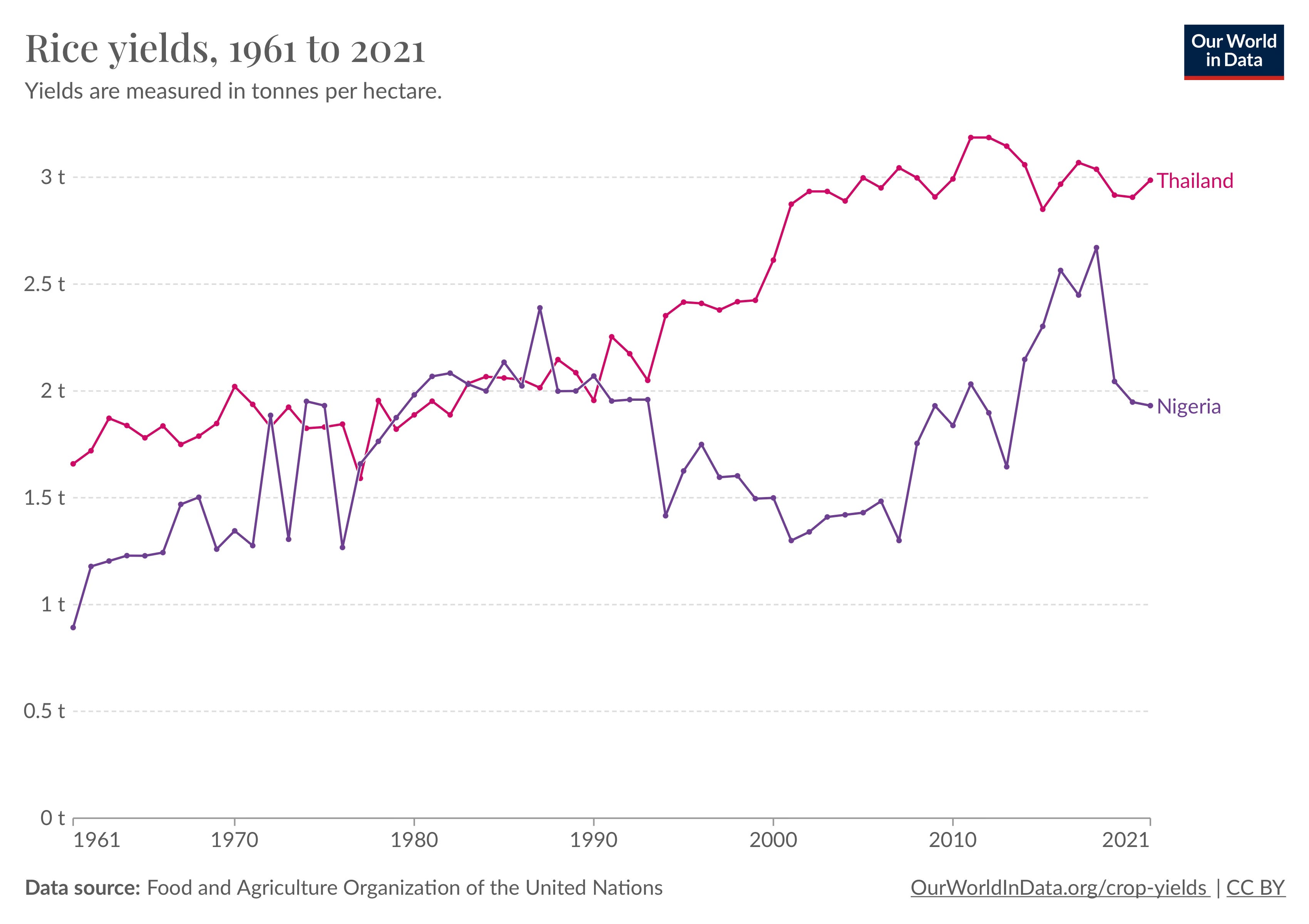 So how much better are rice yields in Thailand compared with Nigeria?