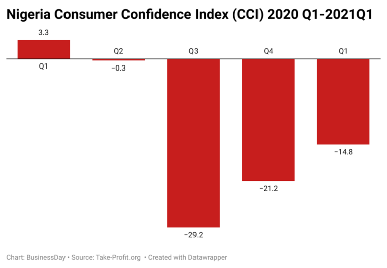 Data from take-profit.org illustrates a rollercoaster ride for Nigeria’s Consumer Confidence Index (CCI) from 2020 Q1 to 2021 Q1, reflecting pronounced shifts in consumer sentiment. Beginning at a modest 3.3 in Q1 2020, the index took a sharp downturn, plummeting to -0.3 in Q2, indicating a significant 110 percent decline.