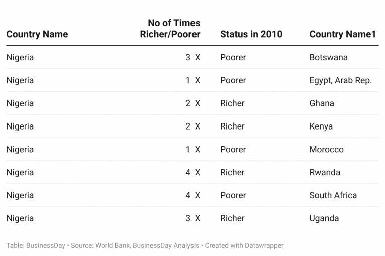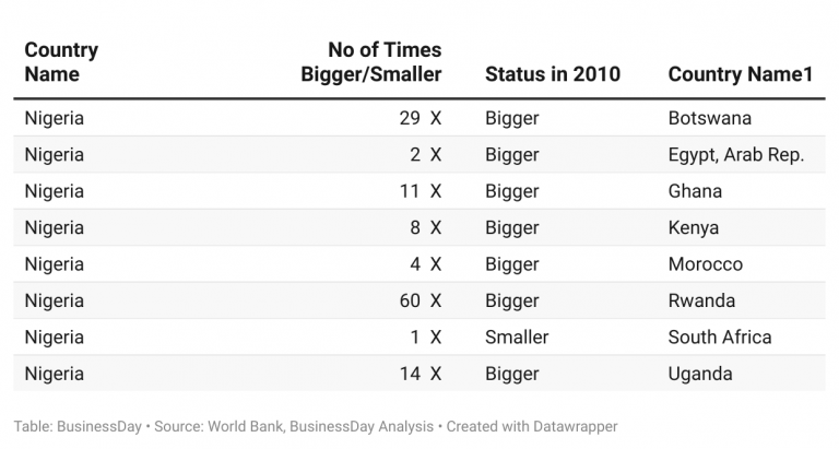 Over the past decade, Nigeria has struggled to keep pace with the economies ahead of it, while those once trailing have closed the gap and, in some cases, overtaken it.