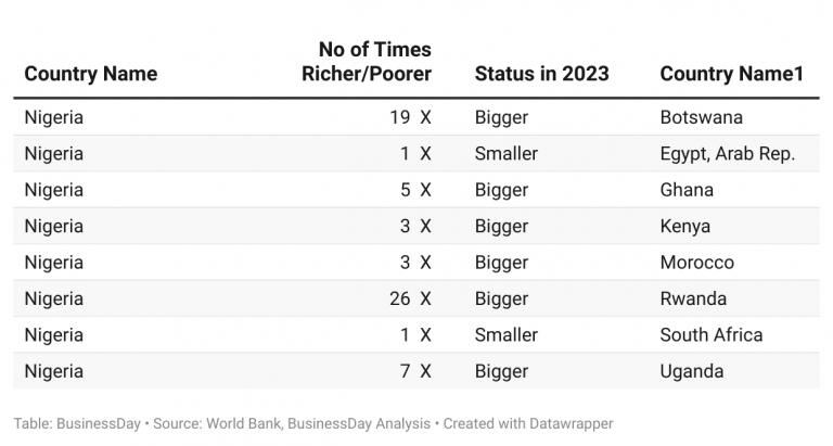 In 2010, the average Nigerian was 2.62 times wealthier than their counterparts in Ghana, Kenya, Rwanda, and Uganda. Fast forward to 2023, that advantage has dwindled by 39 percent, leaving Nigerians only 1.61 times wealthier. On average, a Kenyan and a Ghanaian are now 1.3 times wealthier than a Nigerian, while Rwanda and Uganda have virtually caught up according to BusinessDay analysis.