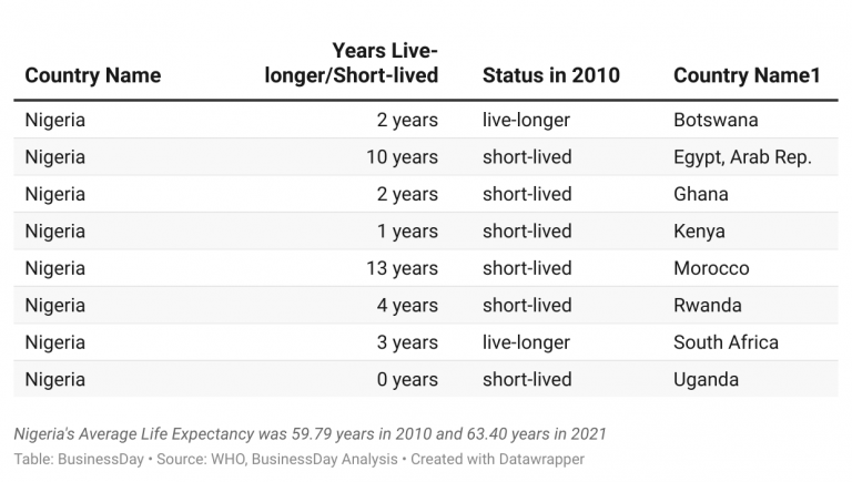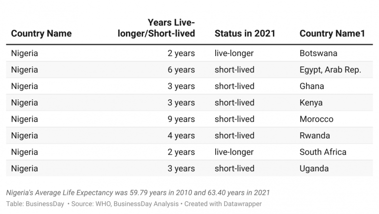 In 2010, a Nigerians life expectancy exceeded that of Botswanans and South Africans by 2.43 years on average. By 2021, the gap has been reduced to 2.03 years. While Nigeria’s average life expectancy rose marginally from 59.79 years in 2010 to 63.40 years in 2021, few other nations have made far greater strides.