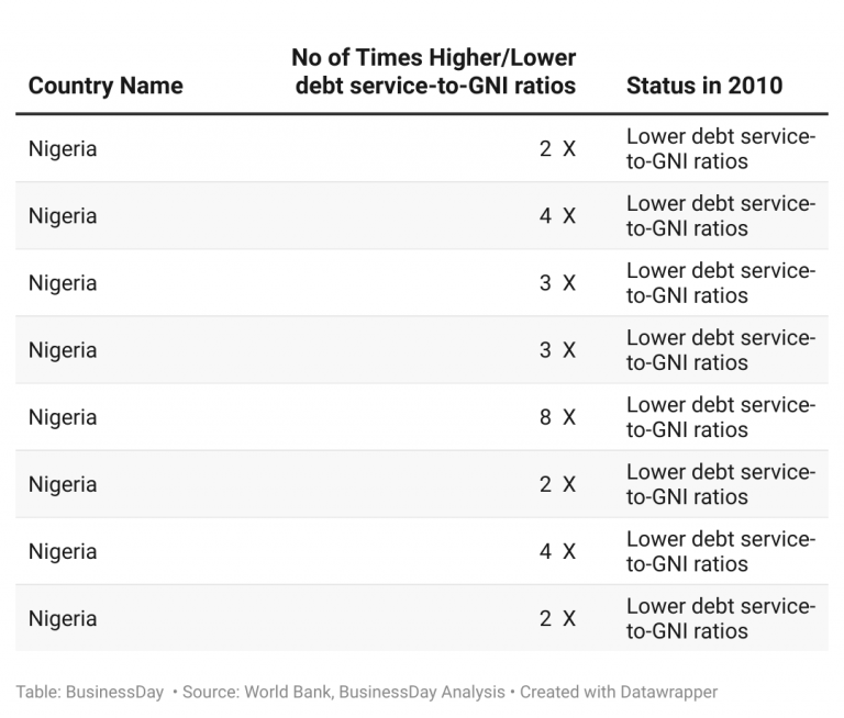 Economic theory emphasises debt’s role in financing essential public goods during periods of growth. In 2010, Nigeria’s debt service to Gross National Income (GNI) ratio was 3.29 times lower than the average of its peer nations. By 2022, this gap had narrowed to 2.38 times, indicating Nigeria’s relative underutilisation of debt.