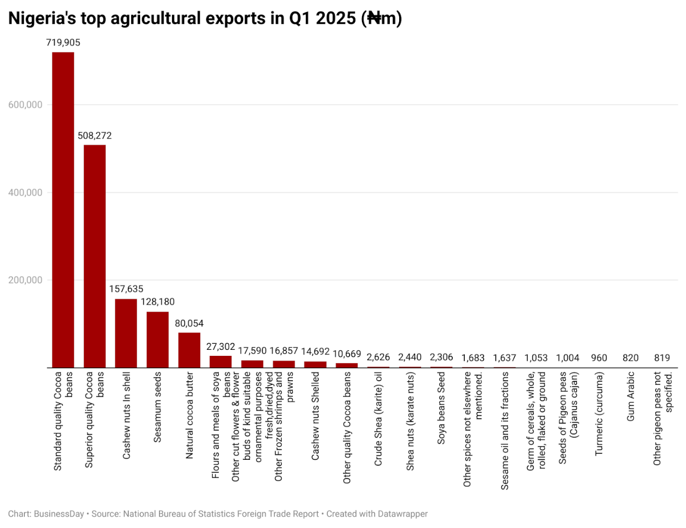 Between January and March, raw commodities accounted for over 92 percent of total agricultural exports, while processed goods made up just over seven percent. Cocoa remained export champion. Despite being the fourth largest cocoa producer, Nigeria still processes less than 13 percent of its cocoa locally, spending millions to buy back its derivatives from other cocoa producers.