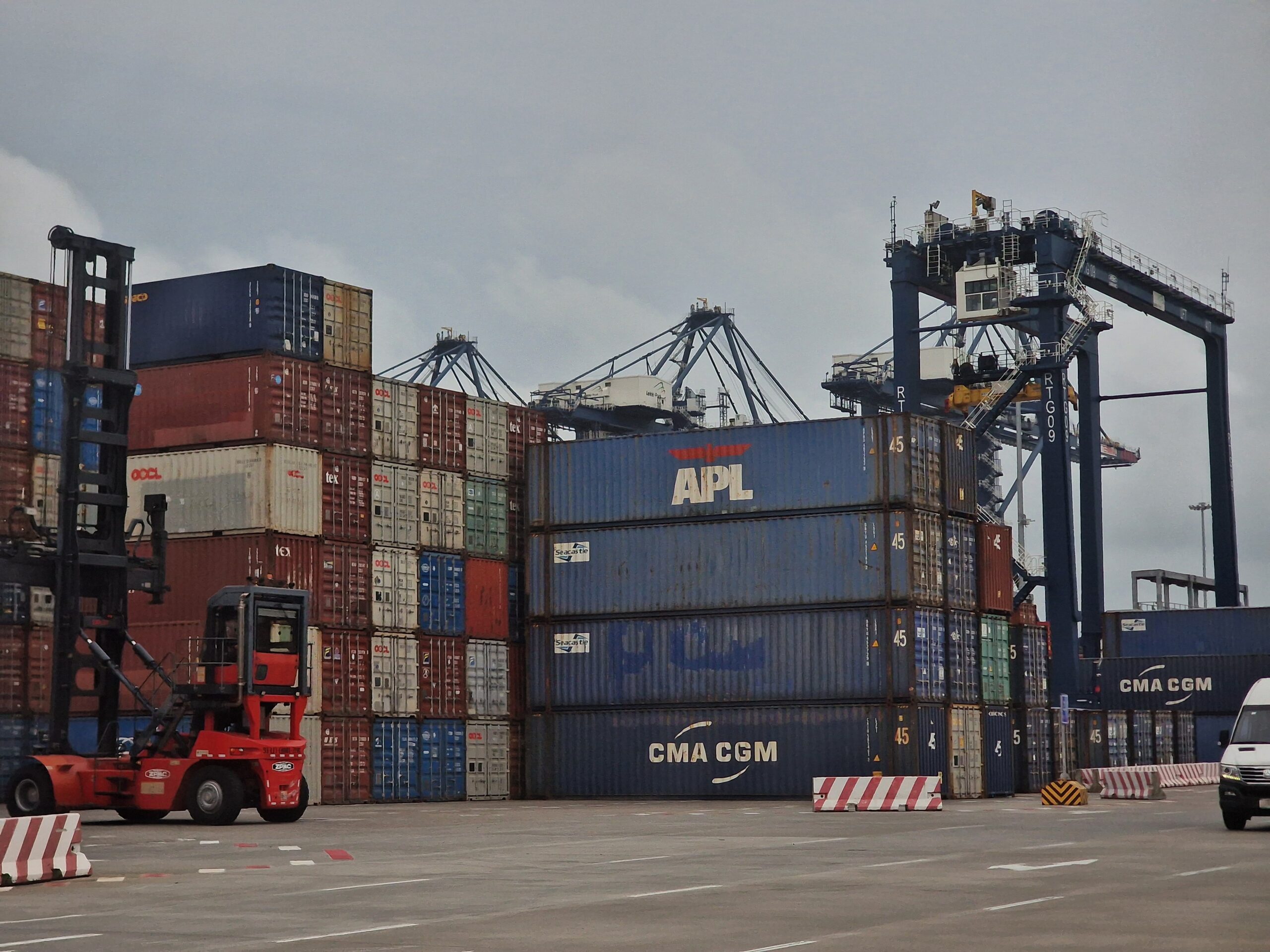 The moment you step into the terminal, the sheer scale hits you. Containers are stacked in tight rows. Familiar names, ONE, CMA CGM, MAERSK, COSCO SHIPPING, APL, lined up like city blocks.