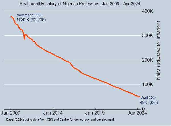 Domestic incomes are not insulated. Adjusted for inflation and exchange rates, on average, a Nigerian professor now earns $35 per month, down from over $2,000 in November 2009, the last time the pay was raised. In local currency, their salary has sunk from N342k to N49k. In other words, within 175 months, inflation and worsening exchange rates have wiped out roughly N293k from the take-home pay of the high-earning academics. See the evidence below.