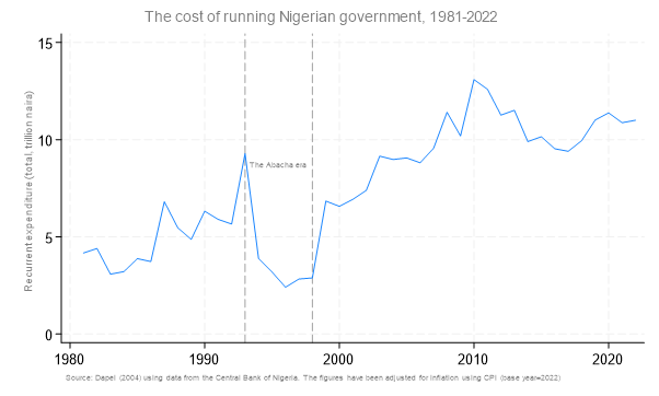 Moreover, the return of democracy expanded the size and the cost of running the government – raising total recurrent expenditure. The graph below paints the rise in government spending over the past 20 years, marking a period of massive cash infusion into the economic system in the post-military juntas.