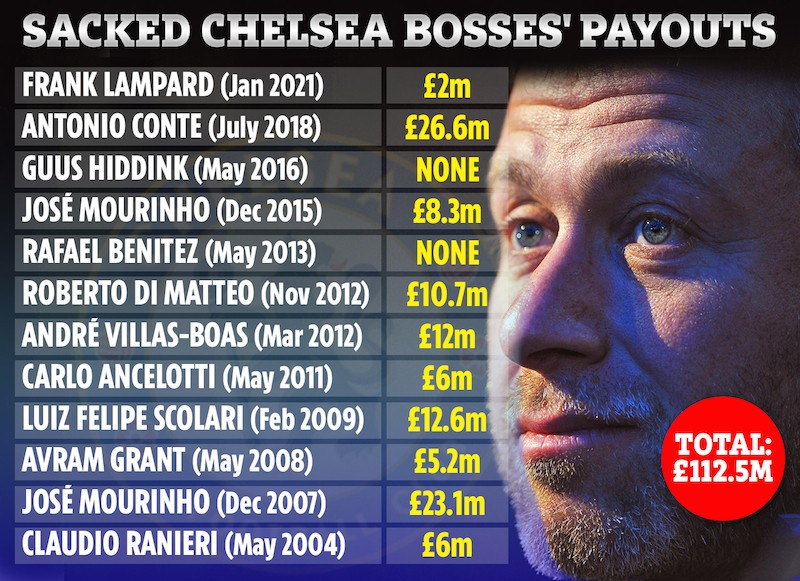 Roman Abramovich has spent a staggering £112.5 million paying off sacked managers since taking over as Chelsea owner in 2003.
