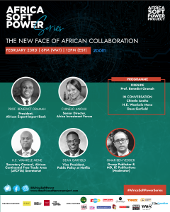 Prof. Benedict Oramah of the African Export-Import Bank, Ms. Chinelo Anohu of the Africa Investment Forum, H.E Wamkele Mene of the African Continental Free Trade Area (AfCFTA) and Dean Garfield, Vice President, Public Policy at Netflix will tomorrow speak at a virtual event hosted by The Africa Soft Power Project. The session titled, ’The New Face of African Collaboration’, brings these leading voices together to discuss the evolution of infrastructure development on the continent and the transformative possibilities that this age of connectivity holds for Africa’s creative industries and knowledge economy.