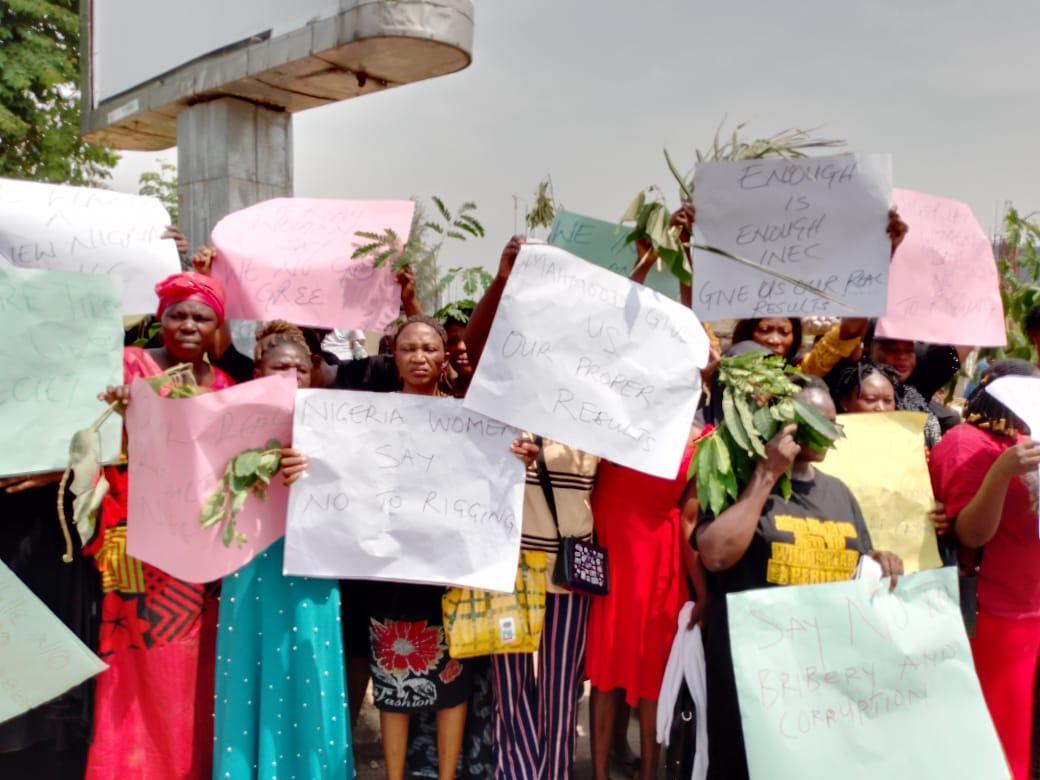 The women who carried leaves were protesting alleged rigging of the results of the presidential election and were intercepted by security operatives at the junction connecting the Central Bank of Nigeria, the National Defence (War) College and the ICC.