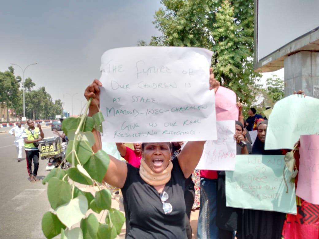 The protesters were chanting: ‘we no gree oo’, ‘Mahmood give us results ‘original results na im we want’ and they carried placards with various inscriptions including, ‘INEC stop rigging’, ‘future of our children at stake’, ‘Mahmood give us our results’, ‘we are tired of injustice’, ‘occupy INEC now’.