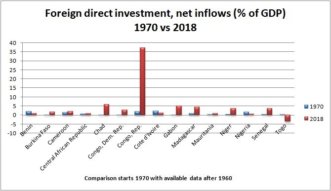 In terms of Foreign Direct Investment, net inflows as a percentage of GDP, in 1970, a decade after independence and available data, Nigeria ranked 4th with 1.63 percent.