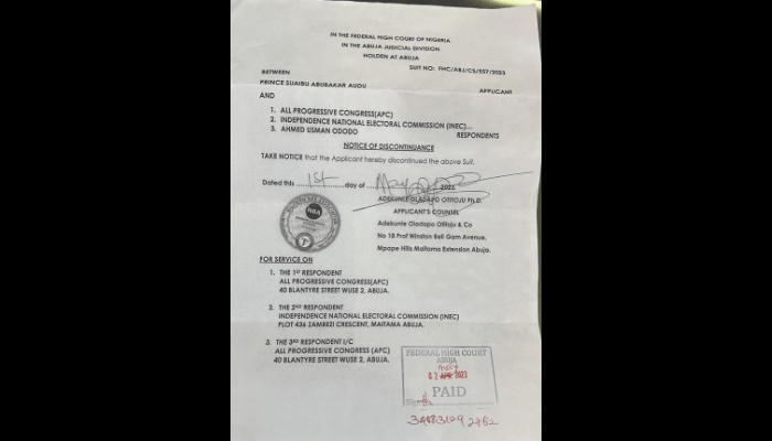 One of the aspirants of the All Progressives Congress (APC) in the direct primary election held in Kogi State on April 14, 2023, Shaibu Abubakar Audu, has withdrawn the lawsuit he instituted against the party and the winner of the primary, Usman Ododo.