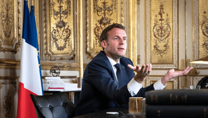 “We are all embarking on the unthinkable,” says Emmanuel Macron, leaning forward…