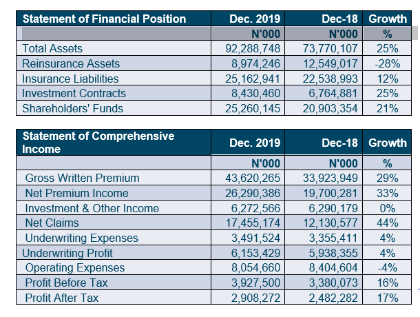 • Gross Written Premium of N43.62bn, up 29% from N33.92bn in December 2018