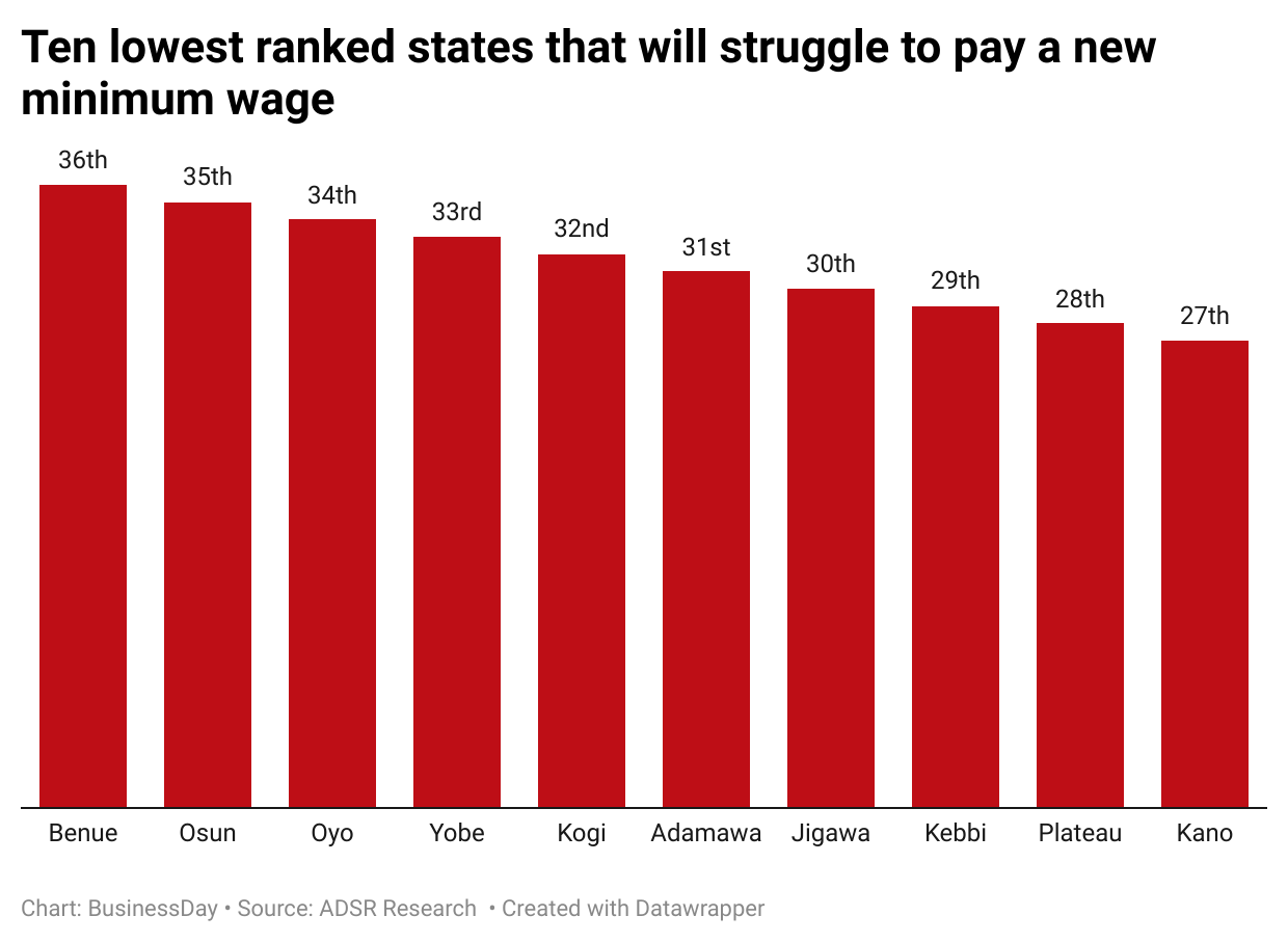 Analysts Data Services and Resources (ADSR), a research firm, has identified Benue, Osun and Oyo as states that have the least ability to pay and finance a new minimum wage.