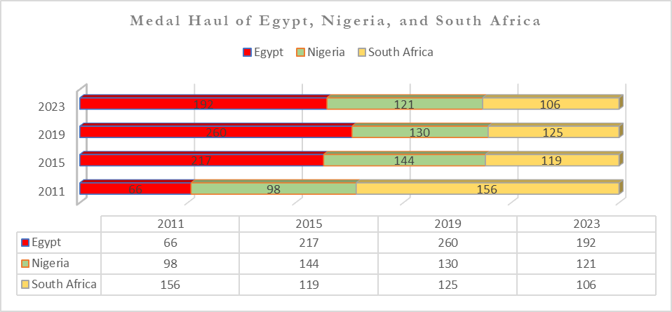 Egypt’s impressive haul of 197 medals reflects the nation’s deliberate and strategic investment in sports infrastructure, accelerated talent development, early preparation with a strong commitment to high-performance training, and an unflinching approach to sports diplomacy and collaboration. Egypt creates a network of collaborations across different sporting units. For example, most of the football clubs in Egypt have their respective counterparts in other sporting disciplines. Al-Ahly, one of the most successful Egyptian clubs, had corresponding teams in basketball, handball, volleyball, tennis, and other disciplines. Similarly, Zamalek and Ismaili are other football giants who have corresponding teams in other sporting disciplines.