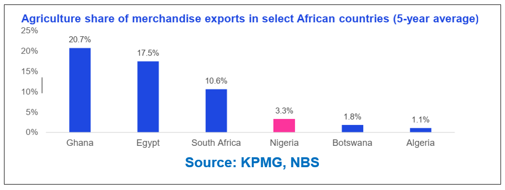 Crop production continues to dominate, making up over 91% of agricultural GDP, while other subsectors — livestock, forestry, and fishing — have stagnated. Nigeria’s agricultural exports account for only 3.3% of total exports, far behind peers like Ghana (20.7%), Egypt (17.5%), and South Africa (10.6%), reflecting weak value addition and poor competitiveness.