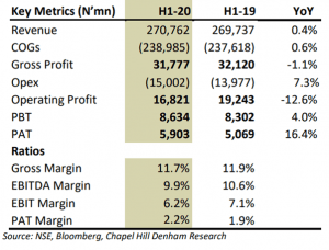 The analysts also expect the Sugar and Agro-Allied segments to maintain current growth trajectories (grew by 15.1 percent year-on-year and 5.1 percent year-on-year respectively to N44.94bn and N49.40bn in H1-20) pushing 2020 turnover to N548.32bn, up 4.0 percent year-on-year from N527.41bn in 2019.