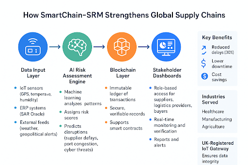 SmartChain-SRM (Supply Risk Management) integrates AI-driven predictive analytics with blockchain’s tamper-proof security to deliver real-time risk detection and mitigation. At its core is a UK-registered design (No. 6461161) for a secure IoT data gateway, ensuring data integrity across supply chain nodes like warehouses, ports, and distribution hubs.