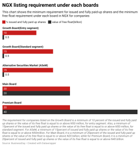 For ASeM, NGX RegCo rule requires a minimum of 15percent of issued and fully paid up shares or the value of its free float is equal to or above N50million. For Main Board, it is a minimum of 20percent of the issued and fully paid up shares or the value of its free float is equal to or above N20 billion; while for Premium Board, it is a minimum of 20percent of issued and fully paid up shares or the value of its free float is equal to or above N40 billion.