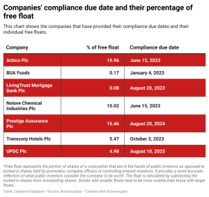 Stocks with smaller floats tend to be more volatile than those with larger floats. For those that have provided timeline for compliance, investors will face limited risk of volatility compared with the companies that have not provided timeline for free float compliance.