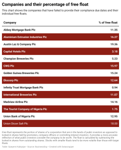 The companies that are deficient in their free float but did not provide timeframe for compliance according to NGX RegCo are: Abbey Mortgage Bank Plc (11.35percent); Aluminium Extrusion Industries Plc (16.27percent); Austin Laz & Company Plc (19.36percent), Capital Hotels Plc (3.18percent), Champion Breweries Plc (5.23 percent); CWG Plc (15.97percent); Ekocorp Plc (12.64percent); Golden Guinea Breweries Plc (15.24percent); Infinity Trust Mortgage Bank Plc (0.94percent); and International Breweries Plc (11.07percent). The list also includes Medview Airline Plc (14.16percent); The Tourist Company of Nigeria Plc (1.75percent); Union Bank of Nigeria Plc (12.95percent); and Union Dicon Salt Plc (18percent).