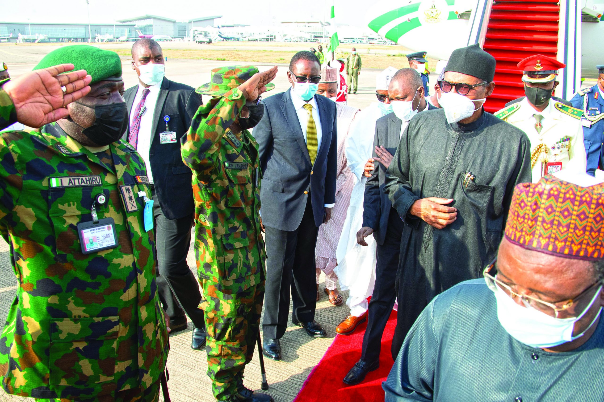 Those at the airport to welcome him included the Chief of Staff to the President, Ibrahim Gambari, the minister of the Federal Capital Territory (FCT), Muhammed Bello, and the National Security Adviser, Babagana Monguno.