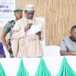 The confusion, which saw many party supporters trouping out of the stadium as the atmosphare was charhed, intensified when the APC national chairman, Adams Oshiomhole mounted the podium to speak and present the party flag to APC governorship candidate, Dapo Abilene.