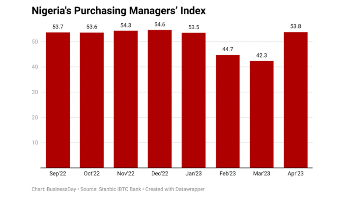 According to the latest monthly PMI by Stanbic IBTC Bank on Tuesday, the headline PMI improved to 53.8 last month from 42.3 in March and 44.7 in February. Readings above 50.0 signal an improvement in business conditions, while readings below 50.0 show deterioration.