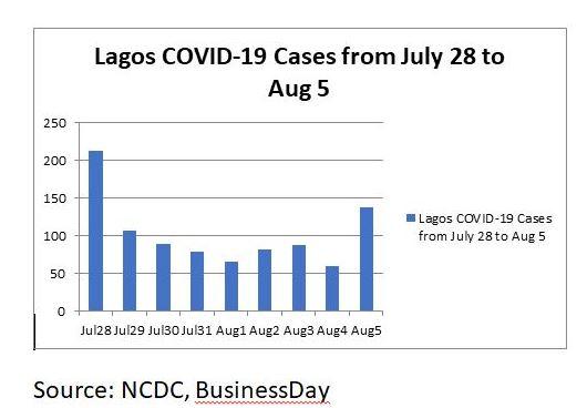 In Lagos, which is the epicentre of the pandemic, cases have crashed 66.5 percent to 71 on August 7 from 212 on July 28. Death to recovery in Lagos stood at 1.46 percent on August 7, below the national average of 2.86 percent. Similarly, death to cases in Lagos was 1.22 percent on same day, far below a national average of 2.04 percent, according to BusinessDay’s analysis of NCDC data.