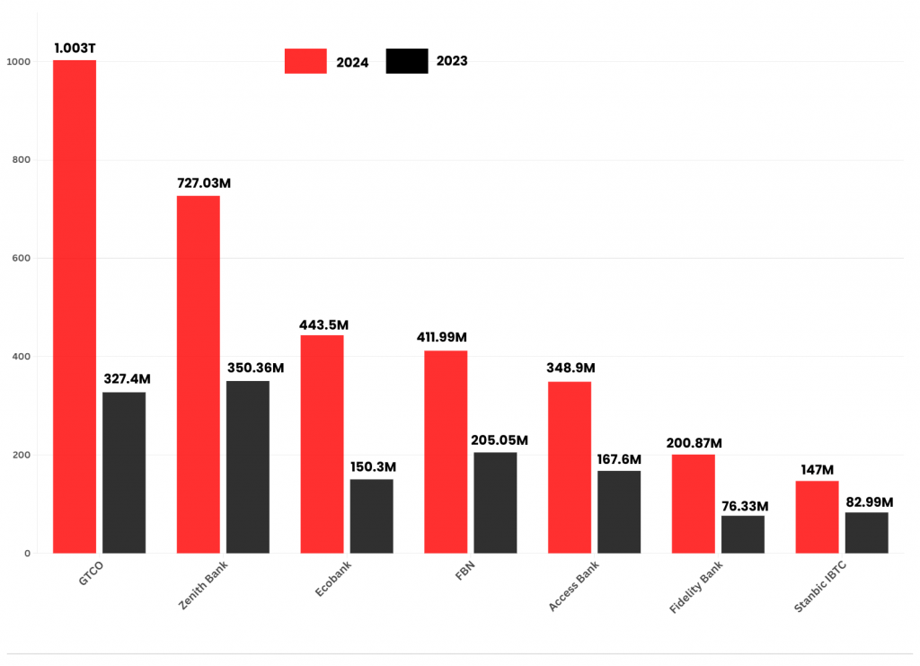 GTCO reported N1.003 trillion profit before tax (PBT) in H1, 2024, about a 207 per cent increase from the N327.4 billion it declared in H1,2023, While the Zenith Bank reported N727.03 billion PBT in H1, 2024, representing a 108 percent increase from the N350.36 billion the bank reported in H1, 2023, Ecobank declared N443.5 billion PBT in H1,2024, representing about 195 percent increase over the N150.3 billion it reported in H1,2023.
