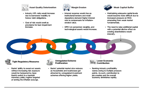 As much as Nigerian banks have thrived amidst the current economic environment, the country’s continued macroeconomic volatility presents a looming threat. High inflation, persistent currency depreciation, and low consumer purchasing power are expected to erode the quality of bank assets, particularly their loan books.