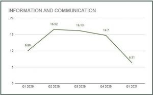 The National Bureau of Statistics (NBS) showed that in the first quarter the ICT sector recorded a growth rate of 6.47 percent in real terms, year-on-year, representing a decline of -1.18 percent from the same quarter in 2020. It is also a -8.46 percentage point lower than the rate recorded in the preceding quarter.