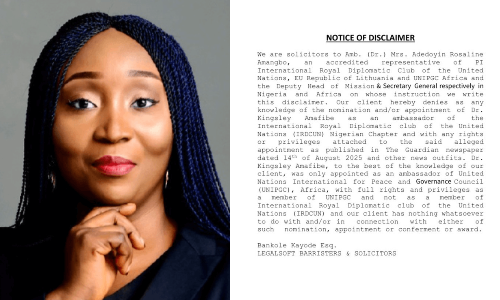 NOTICE OF DISCLAIMER We are solicitors to Amb. (Dr.) Mrs. Adedoyin Rosaline…