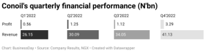 In the first quarter (Q1) of 2022, Conoil Plc’s revenue was down by 21 percent amounting to N26.15 billion from N33.09 billion in the corresponding period of 2021, with the cost of sales accounting for 89 percent of the total revenue reported.