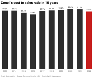 Despite accounting for 87.95 percent of the company’s total revenue during the year, the financial data show that the cost-of-sales ratio reported in 2022 is the lowest in 10 years, down by 324 basis points from 91.19 percent in 2021.