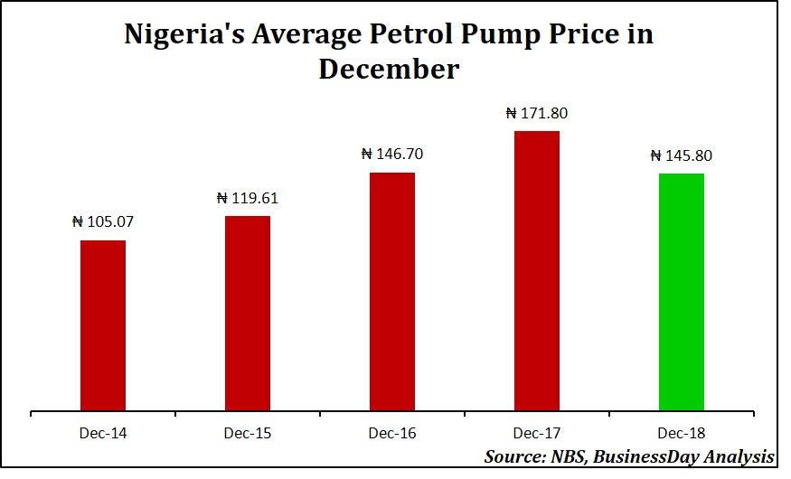 The average price paid by petrol consumers fell by 15.1 percent in December 2018 to N145.80 from a year earlier, the lowest since November 2017. When compared to N171.80 consumers paid in the same period in 2017, it represents the biggest monthly drop so far, according to available data from the National Bureau of Statistics (NBS).