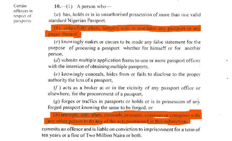 According to Section 10(b) and (h) of the Immigration Act any individual who “unlawfully alters, tampers with or mutilates any passport or any pages,” or “attempts, aides and abets, counsels, procures, connives or conspires with any other person to do any of the acts” is “liable of conviction to imprisonment for a term of ten years or a fine of Two Million Naira or both,” the Act reads.